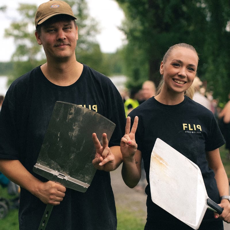 Suuren volyymin tapahtumat ravintolan ulkopuolella, kuten Flow ja Festivaali-festivaali, Vegemessut, Rakkautta ja Anarkiaa -festarin suuri päätösjuhla sekä useat muut yksityistilaisuudet ovat osoittaneet oikeiksi arviomme siitä, että pizza on täydellistä juhlaruokaa tapahtumaan kuin tapahtumaan. Kaikista tapahtumista selviydyimme kunnialla, vaikkakin välillä puutteellinen valmistautuminen ja kokemattomuus tekivät asioista tarpeettoman vaikeita. Onneksi meillä oli apunamme taitava ja sitkeä tiimi, joka auttoi hoitamaan hommat kirkkaasti maaliviivan yli. Tästä pääsemmekin kenties suurimpaan onnistumiseemme yrittäjinä: pystyimme rekrytoimaan FLIPiin aivan järjettömän osaavia tyyppejä, jotka ovat yhdessä nostaneet kaiken seuraaville leveleille. Toisaalta ammattilaistiimin johtaminen ilman vahvaa esihenkilökokemusta vaatii myös jatkuvaa kehittymistä ja itsereflektiota sekä poikkeuksellisen avointa ja joustavaa ilmapiiriä. Ensimmäisen vuoden kenties suurimmat kehittämiskohteet ovatkin liittyneet selkeämmän, turvallisemman ja sujuvamman työympäristön rakentamiseen. Vastuullisen, reilun ja läpinäkyvän työkulttuurin suhteen olemme asettaneet riman niin korkealle, että tuskin olemme koskaan täysin valmiita.